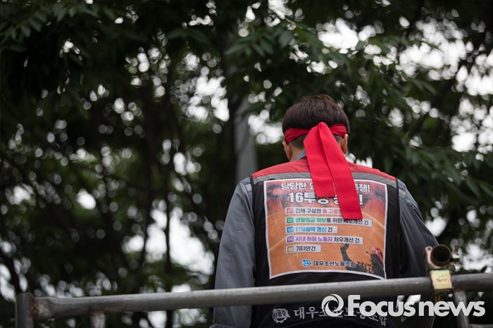 (서울=포커스뉴스) 이틀 전 총파업을 결의한 대우조선해양 노조가 16일 오후 서울 여의도 산업은행 앞에서 사측의 일방적 구조조정에 반대하며 상경투쟁을 벌이는 중 한 노조원의 뒷모습이 보이고 있다.