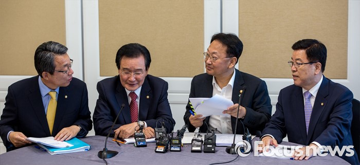 (서울=포커스뉴스) 16일 오후 서울 여의도 국회에서 열린 '2차 민생경제 현안점검회의'에 참석한 3당 정책위의장과 경제부총리가 회의 시작에 앞서 의견을 교환하고 있다. 왼쪽부터 김성식 국민의당 정책위의장, 변재일 더불어민주당 정책위의장, 유일호 경제부총리 겸 기획재정부 장관, 김광림 새누리당 정책위의장.