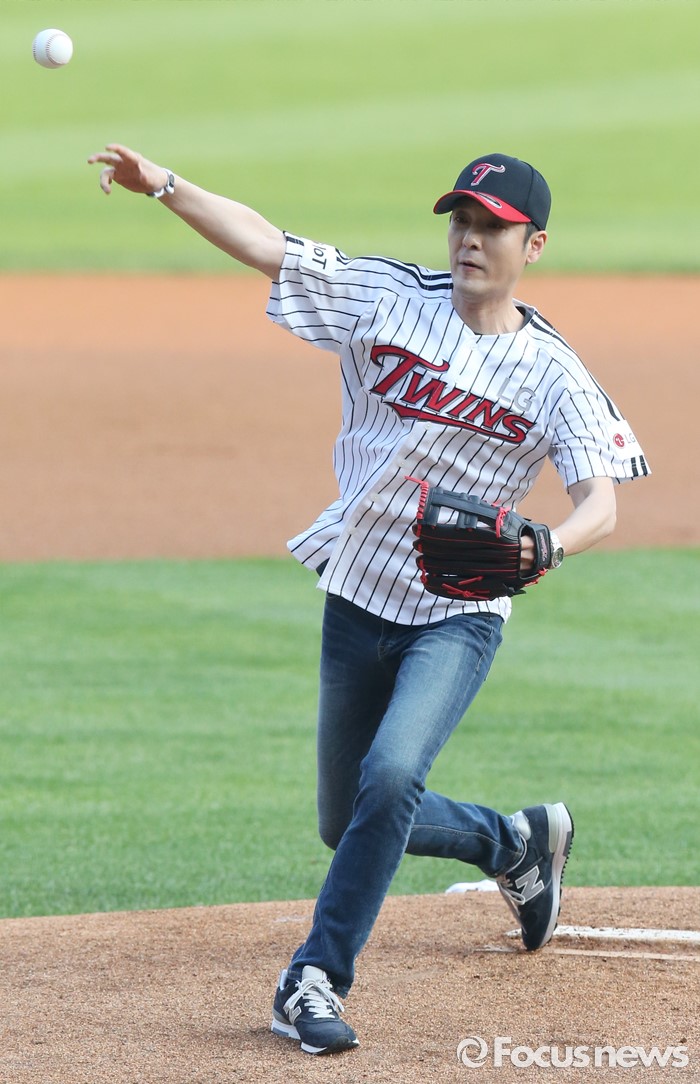 (서울=포커스뉴스) 16일 서울 잠실구장에서 열린 2016 프로야구 NC-LG 경기에서 스윗소로우의 가수 인호잔이 시구하고 있다.
