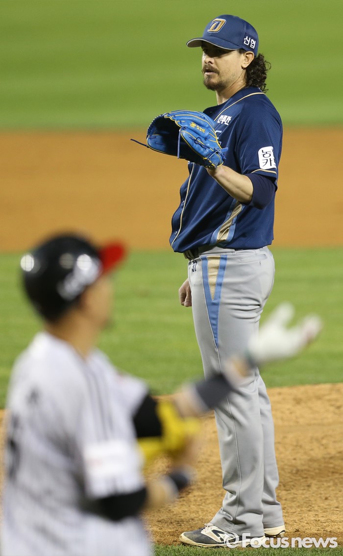 (서울=포커스뉴스) 16일 서울 잠실구장에서 열린 2016 프로야구 NC-LG 경기 8회말 2사후 NC 투수 스튜어트가 LG 정성훈을 몸에 맞는 볼로 진루시키고 있다.