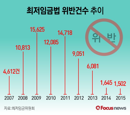 (서울=포커스뉴스) 최저임금위원회 자료에 따르면 2011년 이후 최저임금법 위반 건수가 점차 감소하는 추세다. 2015년 최저임금법 위반 건수는 1502건으로 나타났다.