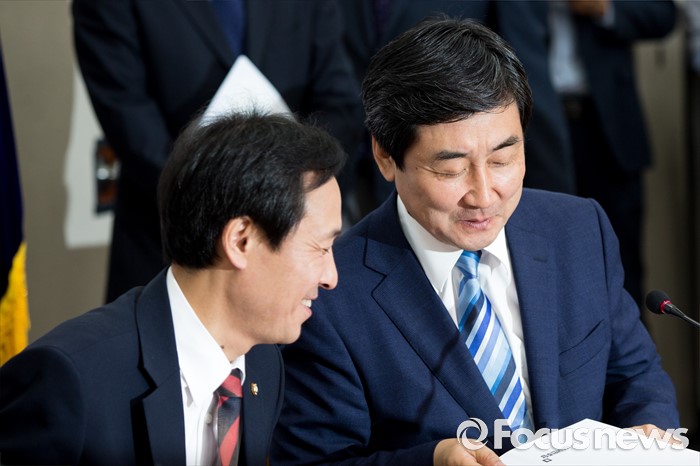 (서울=포커스뉴스) 우상호(왼쪽) 더불어민주당 원내대표와 이종걸 비대위원이 17일 오전 서울 여의도 국회에서 열린 비상대책위원회의에 참석해 대화를 나누고 있다.