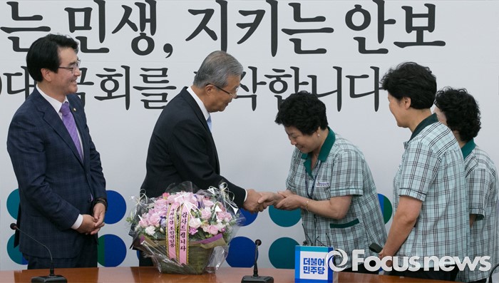 (서울=포커스뉴스) 김종인(왼쪽 두번째) 더불어민주당 비대위 대표가 17일 오전 서울 여의도 국회에서 김영숙(오른쪽 세번째) 국회 환경미화노동조합 위원장 등 관계자들에게 직접고용 해결과 관련 꽃다발을 증정받고 있다.