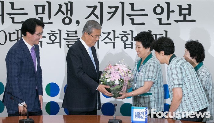 (서울=포커스뉴스) 김종인(왼쪽 두번째) 더불어민주당 비대위 대표가 17일 오전 서울 여의도 국회에서 김영숙(오른쪽 세번째) 국회 환경미화노동조합 위원장 등 관계자들에게 직접고용 해결과 관련 꽃다발을 증정받고 있다.
