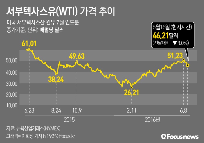 (서울=포커스뉴스) 16일(현지시간) 뉴욕상업거래소(NYMEX)에서 서부텍사스산원유(WTI) 가격은 전날보다 배럴당 1.80달러(3.0%) 하락한 46.21달러를 기록했다.