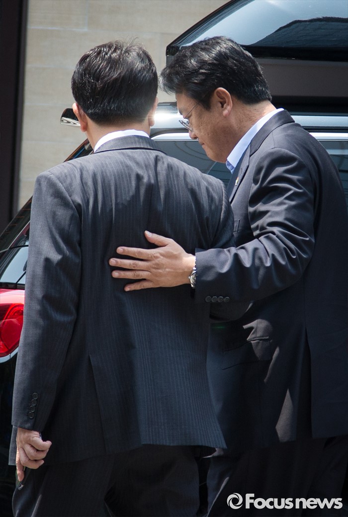 (서울=포커스뉴스) 정진석(오른쪽) 새누리당 원내대표가 17일 오후 서울 여의도 한 음식점에서 비공개 오찬약속을 위해 이동하며 권성동 사무총장과 대화하고 있다.