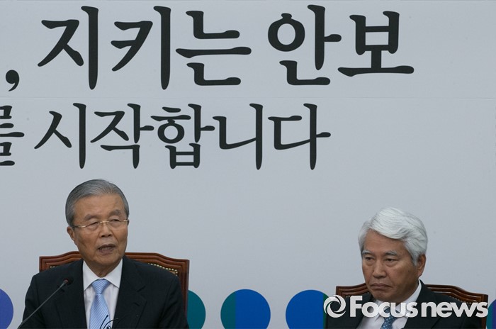 (서울=포커스뉴스) 김종인(왼쪽) 더불어민주당 비대위 대표가 17일 오전 서울 여의도 국회에서 열린 국방안보센터 창립회의에 참석해 인사말을 하고 있다. 오른쪽은 국방안보센터장으로 임명된 백군기 전 의원.