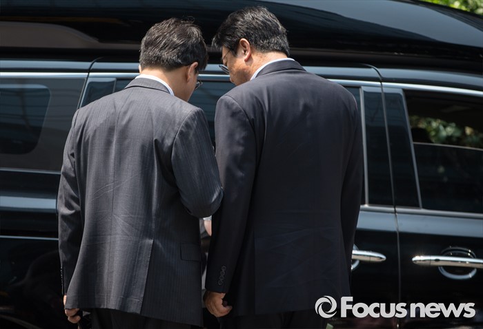 (서울=포커스뉴스) 정진석(오른쪽) 새누리당 원내대표가 17일 오후 서울 여의도 한 음식점에서 비공개 오찬약속을 위해 이동하며 권성동 사무총장과 대화하고 있다.