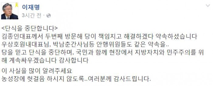 이 시장은 단식농성을 중단한 후 자신의 페이스북에 "당을 믿고 단식을 중단하며 국민과 함께 현장에서 지방자치와 민주주의를 위해 계속 싸울 것"이라고 밝혔다.