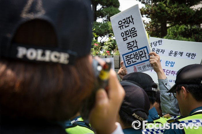 (서울=포커스뉴스) 17일 오후 서울 종로구 서울지방경찰청 앞에서 총선네트워크(총선넷) 회원들이 경찰 과잉수사 및 압수수색 규탄 기자회견을 하고 있다.