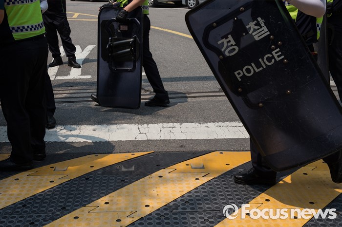 (서울=포커스뉴스) 17일 오후 서울 종로구 서울지방경찰청 앞에서 경찰들이 총선네트워크(총선넷) 회원들의 경찰 과잉수사 및 압수수색 규탄 기자회견장으로 방패를 들고 이동하고 있다.