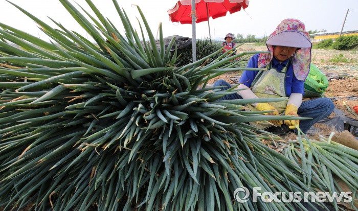 (청주=포커스뉴스) 최고기온이 30도가 넘으며 무더운 날씨를 보인 17일 오후 충북 청주시 흥덕구 들녘에서 농민들이 파를 수확하고 있다.