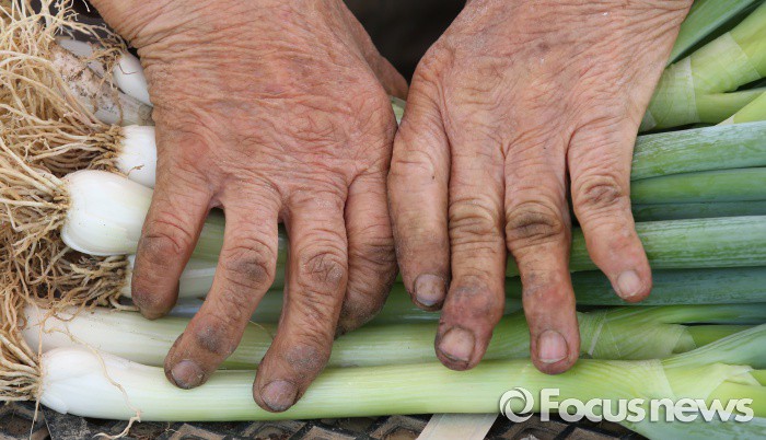 (청주=포커스뉴스) 최고기온이 30도가 넘으며 무더운 날씨를 보인 17일 오후 충북 청주시 흥덕구 들녘에서 농민들이 파를 수확하고 있다.