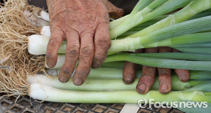 (청주=포커스뉴스) 최고기온이 30도가 넘으며 무더운 날씨를 보인 17일 오후 충북 청주시 흥덕구 들녘에서 농민들이 파를 수확하고 있다.
