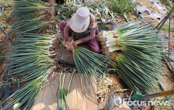 (청주=포커스뉴스) 최고기온이 30도가 넘으며 무더운 날씨를 보인 17일 오후 충북 청주시 흥덕구 들녘에서 농민들이 파를 수확하고 있다.