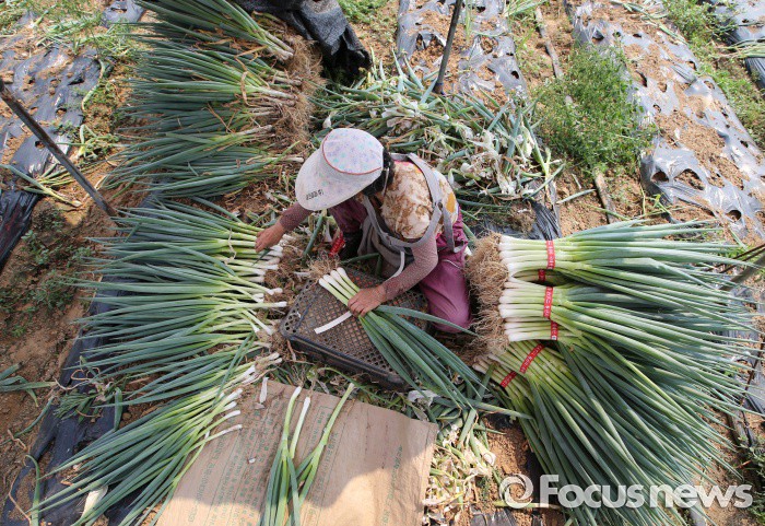 (청주=포커스뉴스) 최고기온이 30도가 넘으며 무더운 날씨를 보인 17일 오후 충북 청주시 흥덕구 들녘에서 농민들이 파를 수확하고 있다.