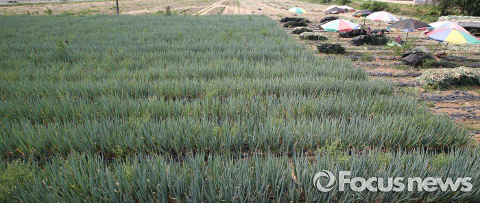 (청주=포커스뉴스) 최고기온이 30도가 넘으며 무더운 날씨를 보인 17일 오후 충북 청주시 흥덕구 들녘에서 농민들이 파를 수확하고 있다.