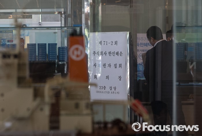 (서울=포커스뉴스) 17일 오후 서울 영등포구 한진해운 본사에서 한진해운 사채권자 집회 참석자들이 접수를 하고 있다.
