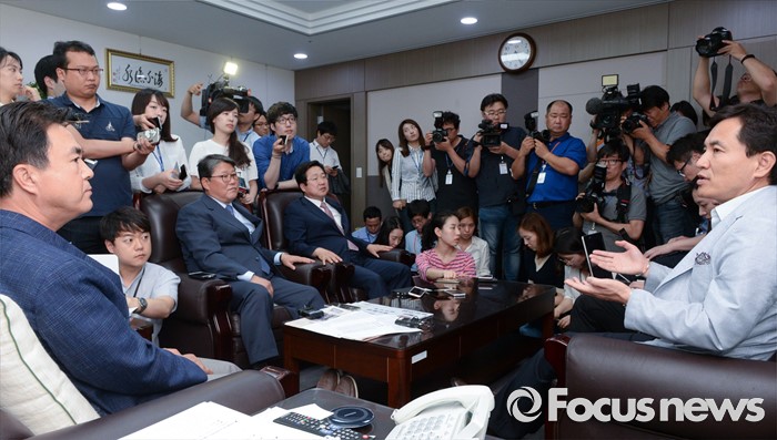 (서울=포커스뉴스) 17일 오후 서울 여의도 국회 의원회관 김태흠 새누리당 의원실에서 조원진, 이장우, 김진태, 김태흠 의원 등 친박계 의원들이 탈당파 복당 문제와 관련 논의를 하고 있다.