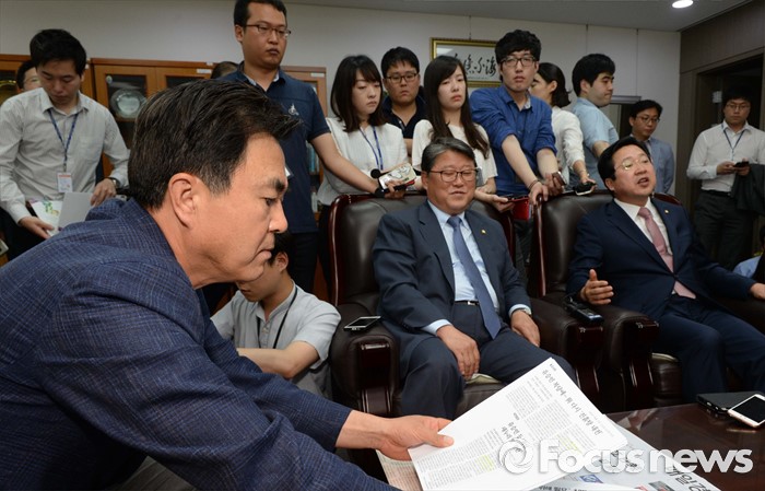 (서울=포커스뉴스) 17일 오후 서울 여의도 국회 의원회관 김태흠 새누리당 의원실에서 김태흠(왼쪽부터), 조원진, 이장우 의원 등 친박계 의원들이 탈당파 복당 문제와 관련 논의를 하고 있다.