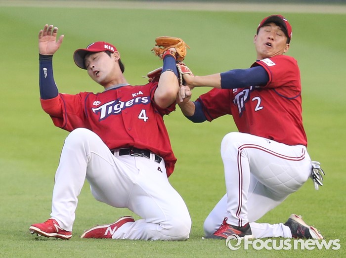 (서울=포커스뉴스) 17일 서울 잠실구장에서 열린 2016 프로야구 KIA-LG 경기 2회말 무사 1루에서 KIA 2루수 서동욱(왼쪽)과 우익수 신종길이 LG 정상호의 뜬공 타구를 잡으며 충돌하고 있다.