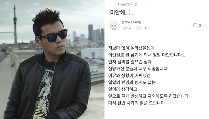 (서울=포커스뉴스) 음주운전으로 검찰 수사를 받고 있는 가수 이정(35)이 팬들에게 사과의 메시지를 남겼다.