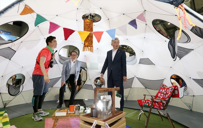 | △ 캠핑용품 전시관 둘러보는 김종덕 장관 |