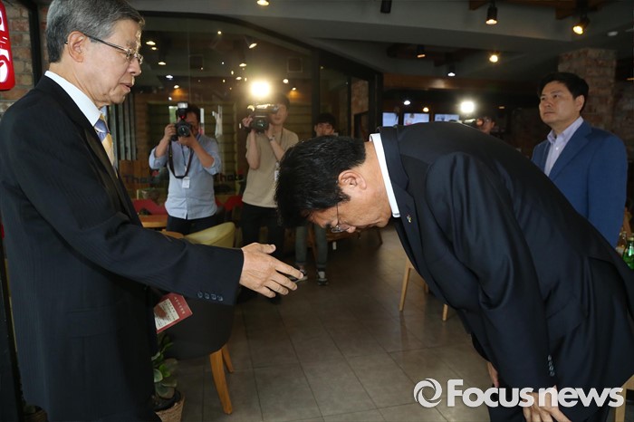 (서울=포커스뉴스) 김희옥(왼쪽) 새누리당 혁신비상대책위원장이 19일 오전 서울 강남구 논현동 한 커피숍에서 지난 16일 유승민 의원 등 복당 표결 과정에서의 발언에 대해 사과하려고 찾아온 정진석 원내대표가 고개를 숙인 채 맞이하자 손을 내밀고 있다.
