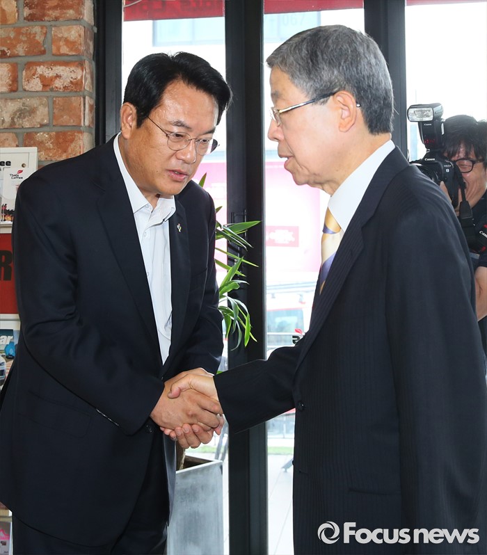 (서울=포커스뉴스) 김희옥 새누리당 혁신비상대책위원장과 정진석 원내대표가 19일 오전 서울 강남구 논현동 한 카페에서 비상대책위원회 정상화를 위한 회동을 하고 있다. 이번 회동은 지난 16일 탈당 무소속 의원들의 일괄복당을 결정한 혁신비대위 회의 과정에 불만을 제기하고 김 위원장이 칩거에 들어간지 나흘째 전격적으로 이뤄진 회동이다.