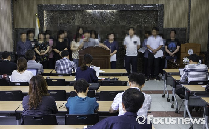 (안산=포커스뉴스) 19일 오전 경기도 안산시 안산교육지원청에서 단원고 재학생 학부모들의 세월호 희생자 존치교실 대안을 촉구하는 기자회견이 열리고 있다. 사진은 재학생 학부모들의 요구로 모자이크 처리 되었다.