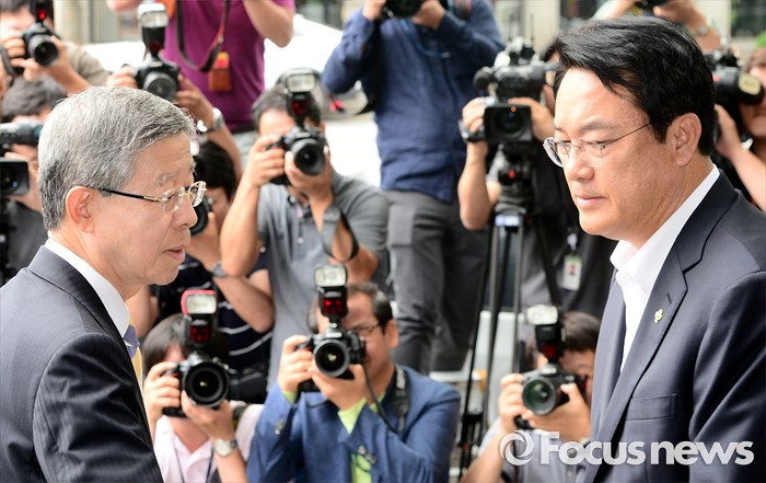 (서울=포커스뉴스) 김희옥(오른쪽) 새누리당 혁신비상대책위원장과 정진석 원내대표가 19일 오전 서울 강남구 논현동 한 커피숍에서 회동을 마친 뒤 인사 하고 있다.