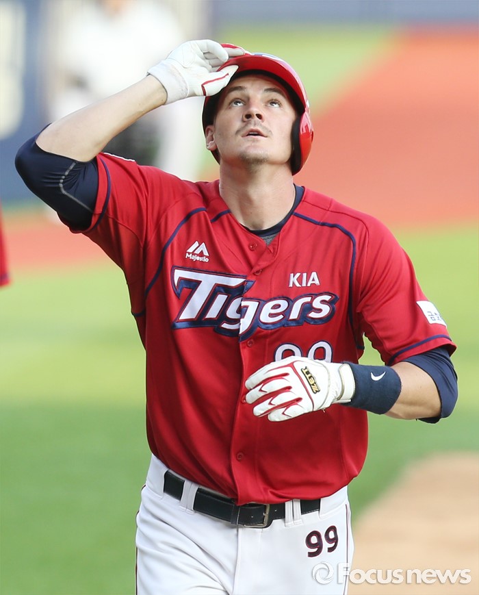 (서울=포커스뉴스) 19일 서울 잠실구장에서 열린 2016 프로야구 KIA-LG 경기 5회초 1사후 KIA 필이 좌월 솔로 홈런을 치고 세레머니를 하며 홈인하고 있다.