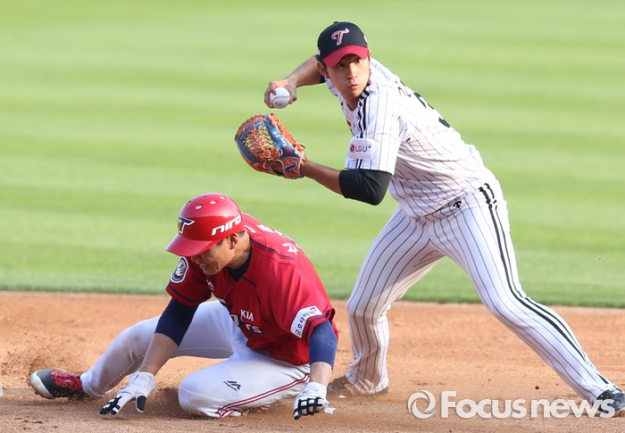 (서울=포커스뉴스) 19일 서울 잠실구장에서 열린 2016 프로야구 KIA-LG 경기 4회초 1사 1,3룽[ㅔ서 KIA 김호령의 2루 땅볼때 1루주지 신종길이 2루에서 포스아웃되고 있다.
