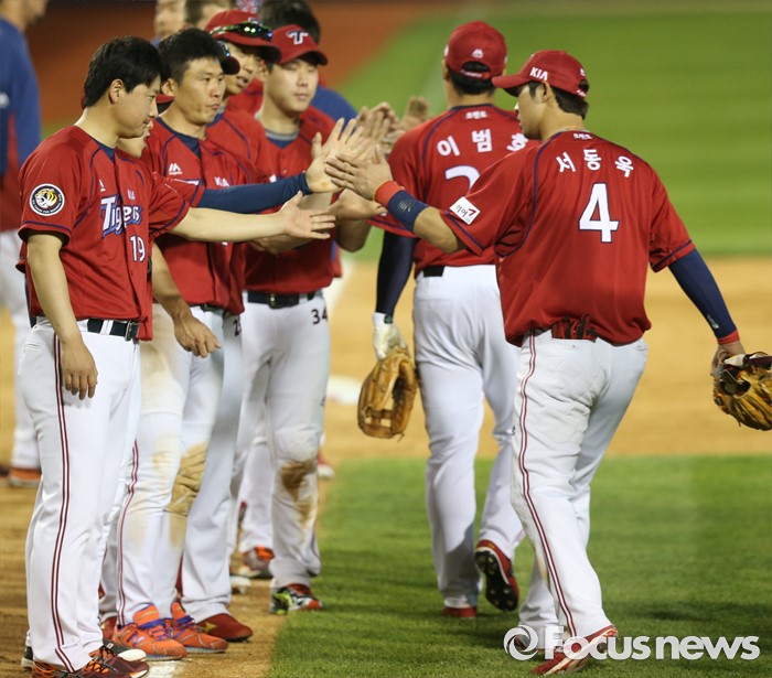 (서울=포커스뉴스) 19일 서울 잠실구장에서 열린 2016 프로야구 KIA-LG 경기에서 LG를 물리친 KIA 선수들이 손바닥을 마주치고 있다.