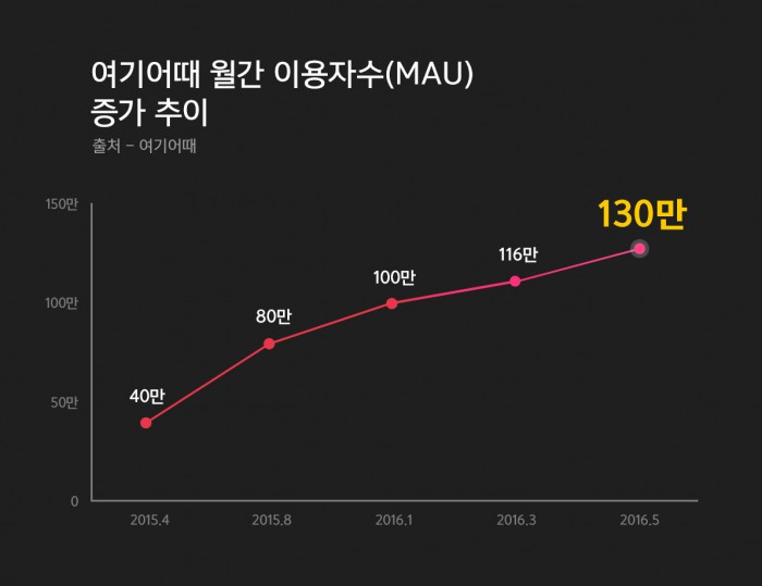 위드이노베이션 문지형 커뮤니케이션 이사는 "중소형호텔 앱의 선두로 자리매김한 '여기어때'와 호텔타임커머스 서비스 '호텔타임'을 앞세워 진정한 종합 숙박 O2O 구현을 나아가고 있다"면서 "숙박시장 혁신을 주도하고, 이용자 편의성 향상을 위한 노력을 다할 것"이라고 강조했다.여기어때 월간 이용자수 증가 추이.<자료제공=위드이노베이션>