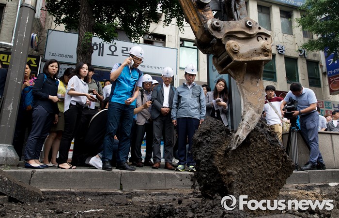 (서울=포커스뉴스) 박원순 서울시장이 20일 오전 서울역 인근 도로에서 동공 굴착 원인조사 및 복구과정을 점검하고 있다.
