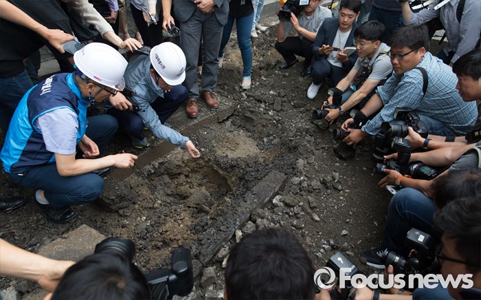 (서울=포커스뉴스) 박원순 서울시장이 20일 오전 서울역 인근 도로에서 동공 굴착 원인조사 및 복구과정을 점검하고 있다.