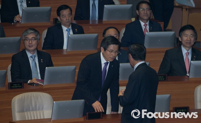 (서울=포커스뉴스) 20일 오전 서울 여의도 국회에서 열린 343회 국회(임시회) 3차 본회의에 참석한 황교안 국무총리가 의원들과 대화하고 있다.