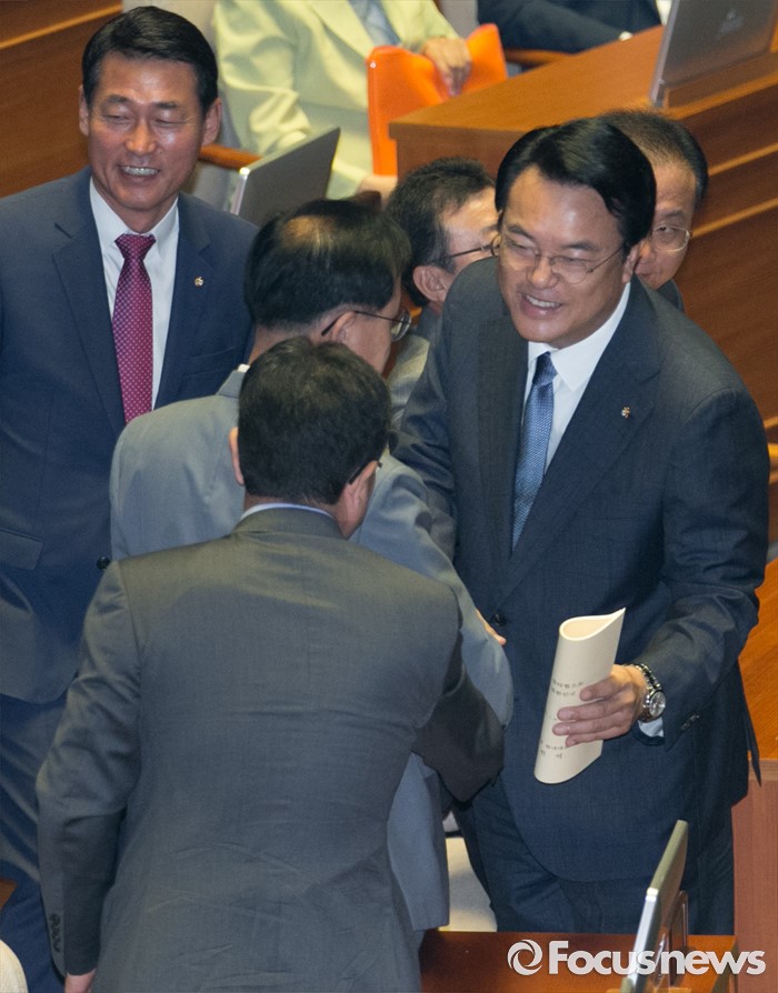 (서울=포커스뉴스) 20일 오전 서울 여의도 국회에서 열린 343회 국회(임시회) 3차 본회의에 참석한 정진석 새누리당 원내대표가 교섭단체 대표연설을 마친 뒤 동료 의원들과 악수하고 있다.