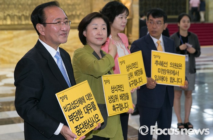 (서울=포커스뉴스) 심상정 정의당 상임대표, 노회찬 원내대표 등 의원들이 20일 오전 서울 여의도 국회에서 열리는 343회 국회(임시회) 3차 본회의에 참석하는 의원들을 향해 추혜선 의원 등의 합당한 상임위 배정을 촉구하는 피켓팅을 하고 있다.