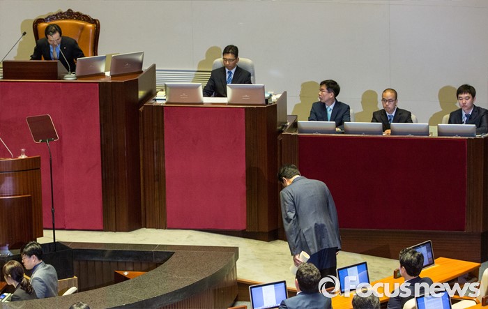 (서울=포커스뉴스) 정진석 새누리당 원내대표가 20일 오전 서울 여의도 국회에서 열린 본회의에 참석해 교섭단체 대표연설을 하기 위해 연단으로 향하며 정세균 국회의장에게 인사 하고 있다.