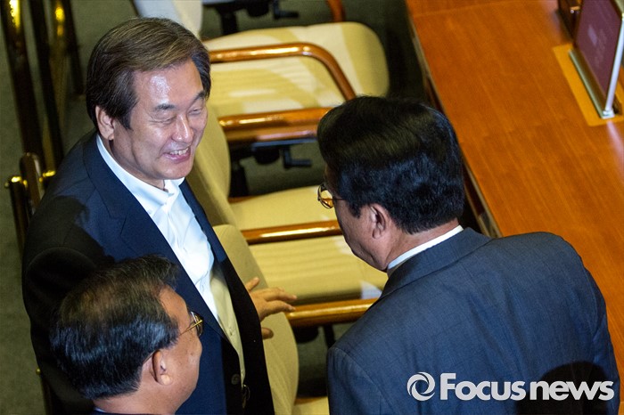 (서울=포커스뉴스) 정진석(오른쪽) 새누리당 원내대표와 김무성 새누리당 전 대표가 20일 오전 서울 여의도 국회에서 열린 본회의에 참석해 대화 하고 있다.