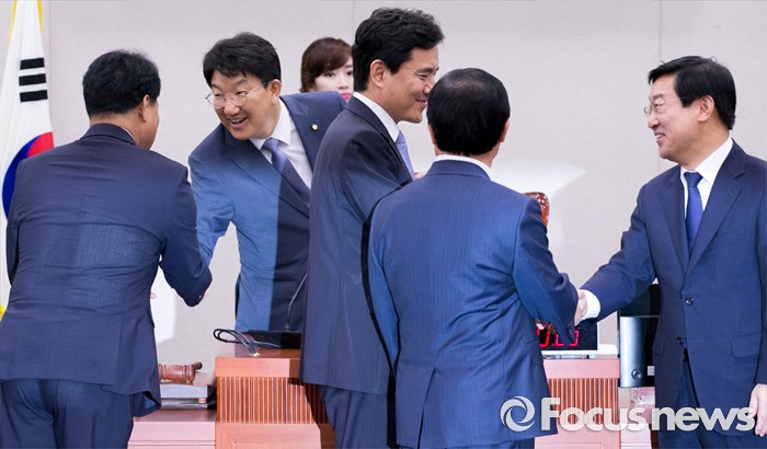 (서울=포커스뉴스) 20일 오전 서울 여의도 국회에서 열린 법제사법위원회 전체회의에 참석한 권성동 위원장과 3당 간사 등이 인사하고 있다. 왼쪽부터 이용주 국민의당 간사, 권 위원장, 김진태 새누리당 간사, 주광덕 의원, 박범계 더불어민주당 간사.