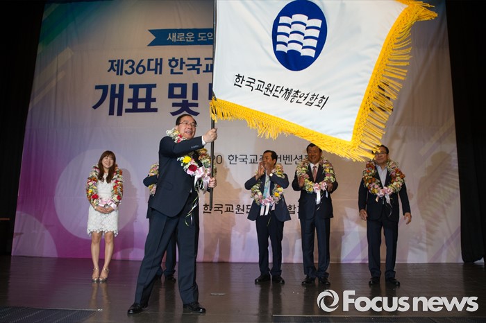 (서울=포커스뉴스) 20일 오전 서울 서초구 한국교원단체총연합회에서 열린 제36대 한국교총 회장선거 개표 및 당선자 발표에서 회장으로 선출된 하윤수 부산교대 총장이 깃발을 흔들고 있다.