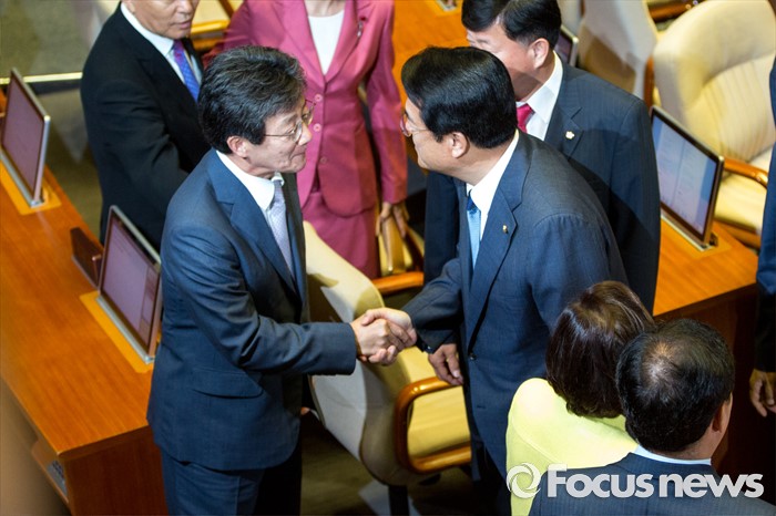 (서울=포커스뉴스) 정진석(오른쪽) 새누리당 원내대표가 20일 오전 서울 여의도 국회에서 열린 본회의에 참석해 교섭단체 대표 연설을 마친 뒤 유승민 새누리당 의원과 악수 하고 있다.
