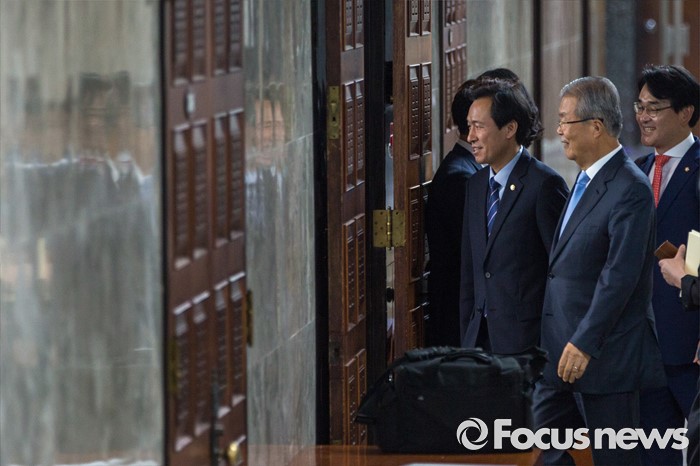 (서울=포커스뉴스) 김종인 더불어민주당 비상대책위 대표와 우상호 원내대표가 20일 오전 서울 여의도 국회에서 열린 '민생국회, 일하는 국회 워크숍'에 참석하기 위해 회의실로 이동 하고 있다.