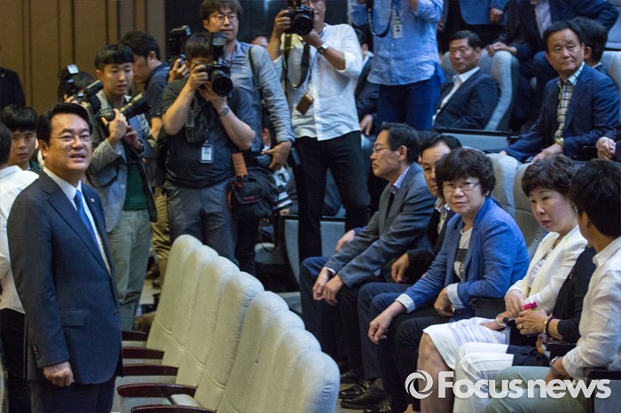 (서울=포커스뉴스) 정진석 새누리당 원내대표가 20일 오전 서울 여의도 국회에서 열린 본회의를 마친 뒤 정 원내대표의 교섭단체 대표연설을 방청하기 위해 본회의장을 찾은 충남 공주시 지역구 주민들과 인사 하고 있다.