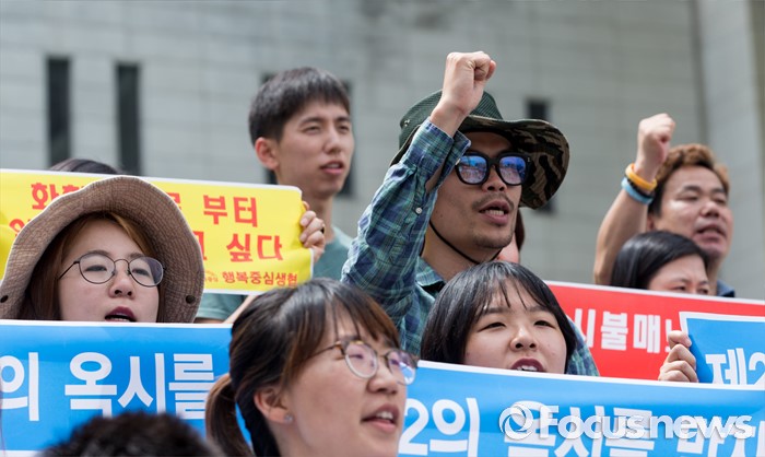 (서울=포커스뉴스) 20일 오후 서울 종로구 세종문화회관 앞 계단에서 환경운동연합과 시민사회단체들이 가습기 살균제 참사 전국네트워크 출범 기자회견을 하고 있다.