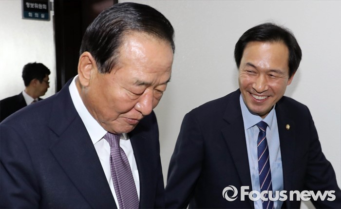 (서울=포커스뉴스) 20일 오후 서울 여의도 국회에서 열린 정보위원회 전체회의에 참석한 서청원(왼쪽) 새누리당 전 최고위원과 우상호 더불어민주당 원내대표가 회의장을 나와 이동하고 있다.