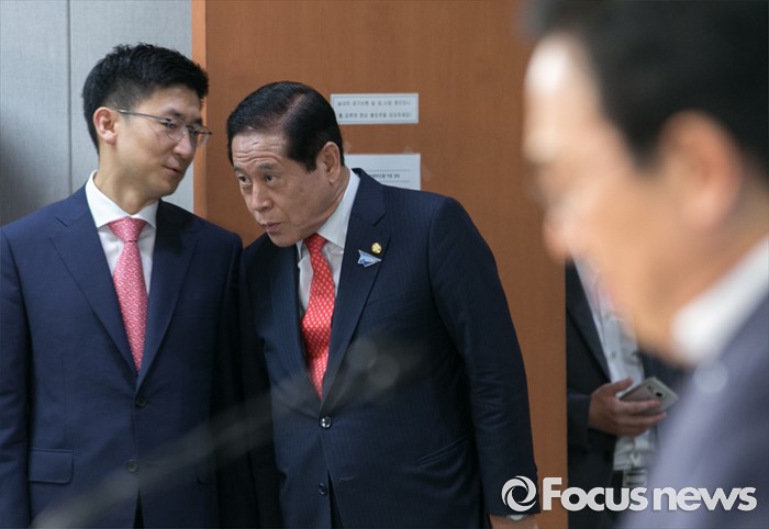 (서울=포커스뉴스) 김세연(왼쪽) 새누리당 부산시당 위원장과 배덕광(가운데) 의원이 20일 오후 서울 여의도 국회 정론관에서 서병수 부산시장의 신공항 입지 결정 관련 입장 발표 기자회견을 지켜보며 대화하고 있다.